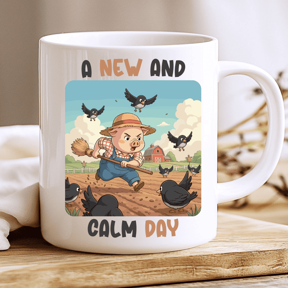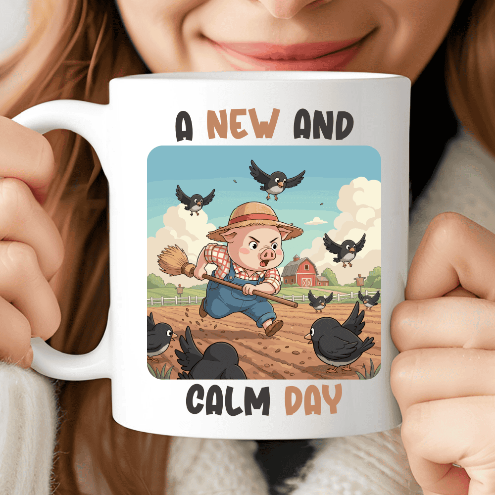 A New And Calm Day is a playful farmer gift mug inspired by the reality of life on the farm — where every peaceful morning can quickly turn into controlled chaos. The design features an adorable pig farmer running through the field, broom in hand, trying to scare off mischievous birds while the farm bustles around him.
