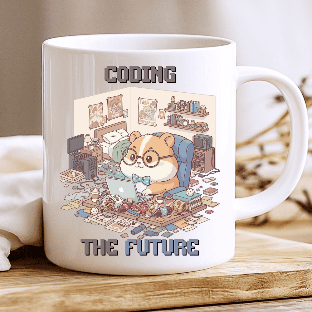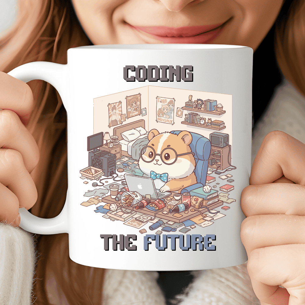 Coding the Future is a charming programmer gift mug made for the people who build what others never see. The design features an adorable hamster programmer sitting at a cluttered desk, focused on writing code and shaping the future one line at a time. It’s cozy, relatable, and full of quiet tech humor.