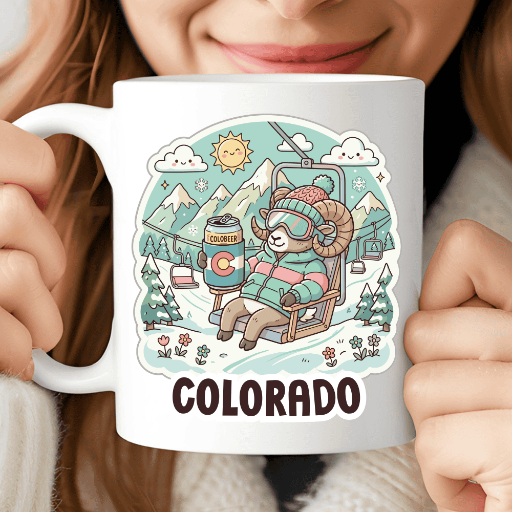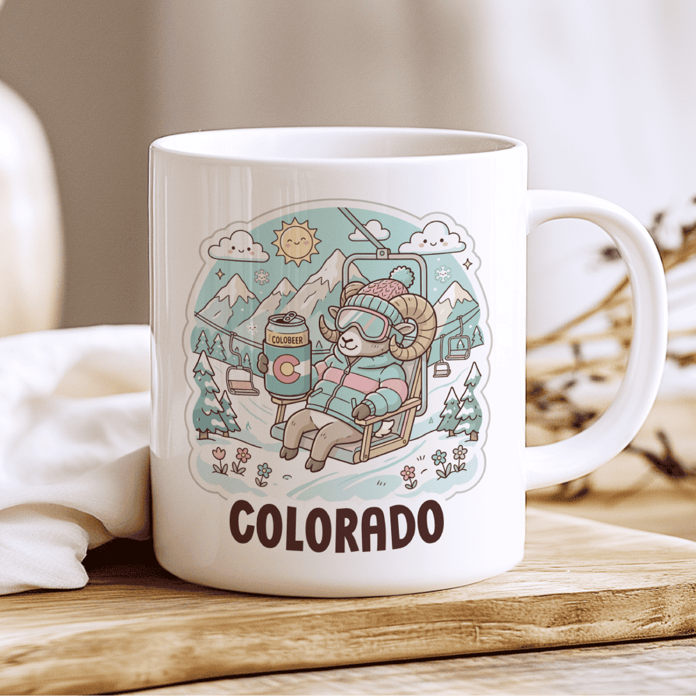 Ride the Rockies from Your Kitchen. Elevate your morning routine with a Colorado Mug that’s ready for the freshest powder and the coolest vibes. This vibrant illustration stars a round, happy Bighorn Sheep—the iconic symbol of the state—decked out in a colorful puffer jacket, ski goggles, and a warm beanie. Gliding through the snowy peaks on a vintage chairlift, our woolly friend is seen enjoying a “Colobeer” while taking in the breathtaking views of the pine-covered slopes and smiling mountain sun.