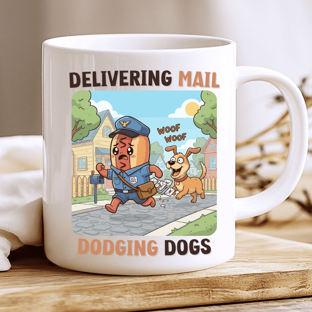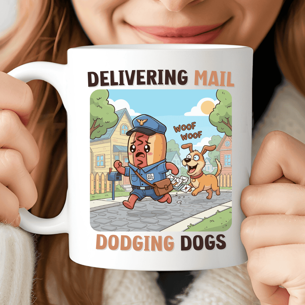 Delivering Mail, Dodging Dogs is a playful and relatable mail carrier gift mug inspired by one of the most classic moments of postal life. The design shows a cheerful delivery character in uniform sprinting down a suburban street while a happy, barking dog chases behind — letters flying everywhere.