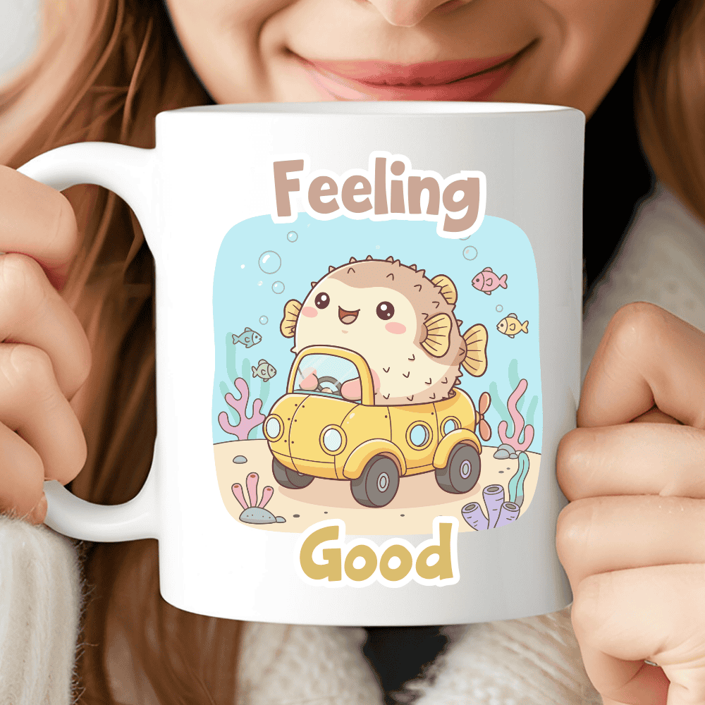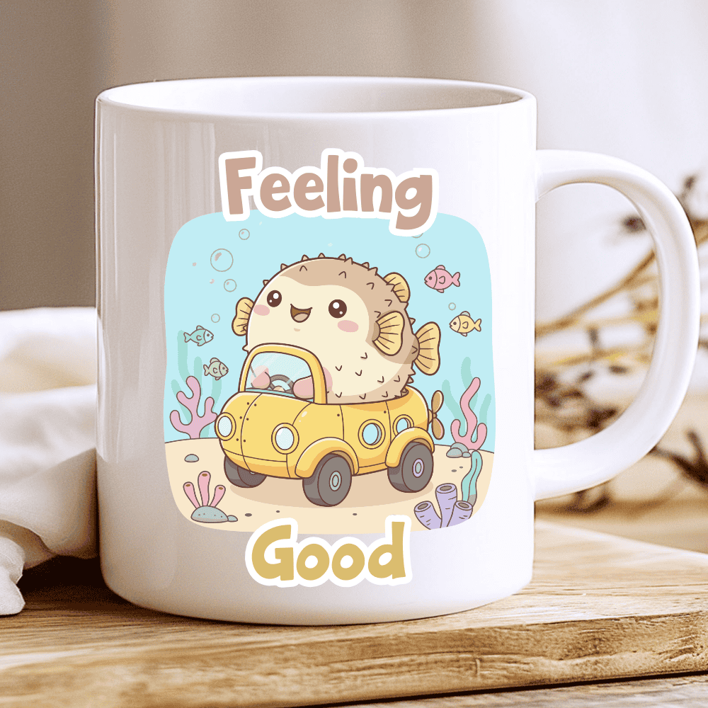 This Kawaii Pufferfish Mug features a cheerful little pufferfish casually driving underwater, as if marine traffic and salty roads were just another Tuesday. It’s weird in the best possible way — cute, quirky and impossible to ignore.
