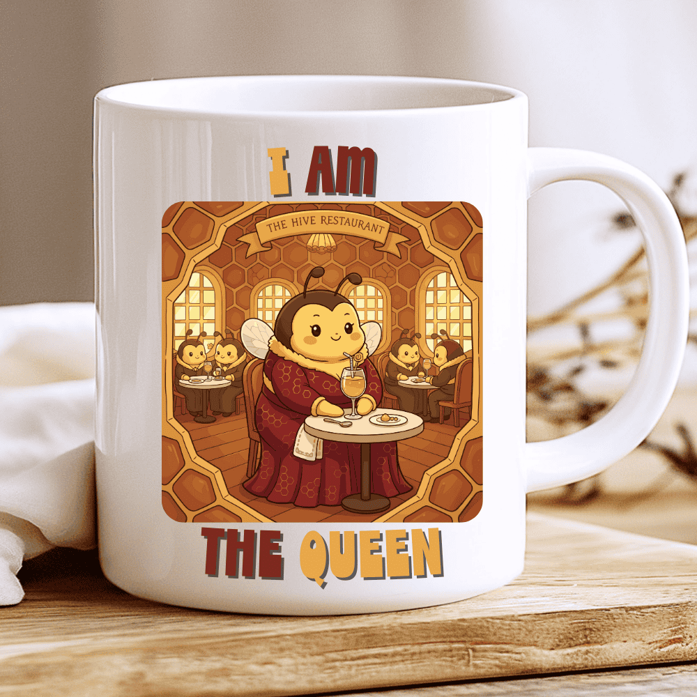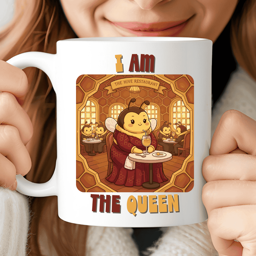 Some mugs are cute, some are funny, and then there’s this one — the mug that quietly reminds the room who’s in charge. With a queen bee dining in style at her hive restaurant, this design has the perfect blend of confidence, humor and “I deserve nice things” energy.