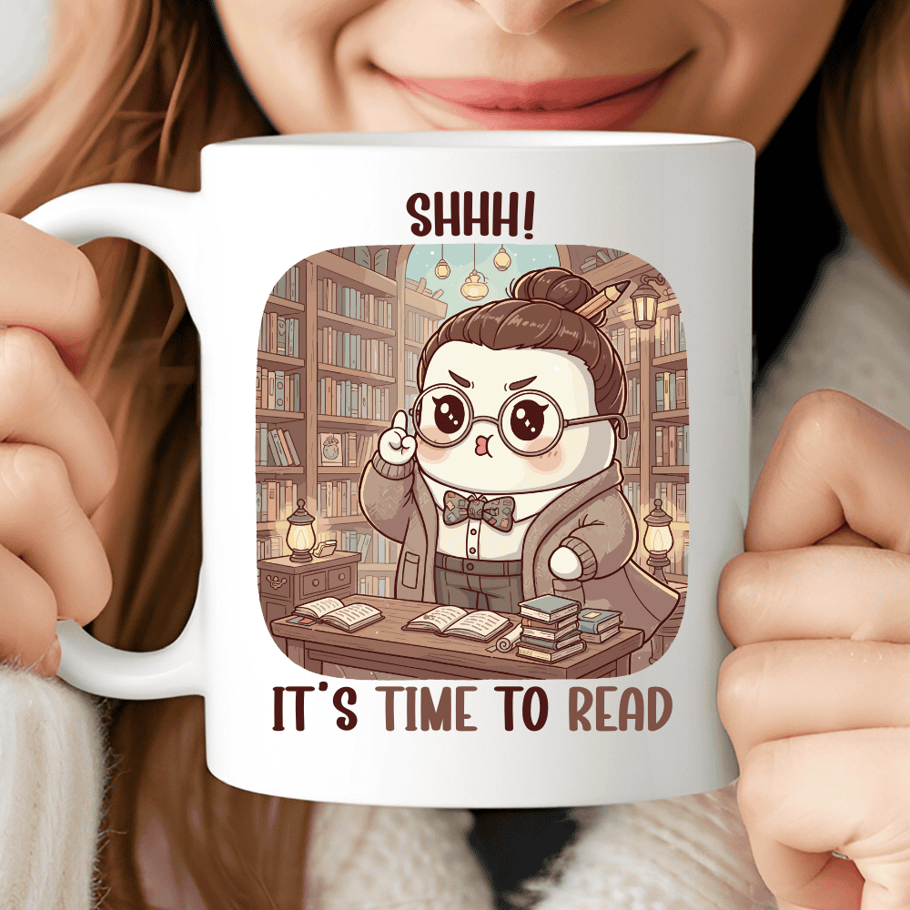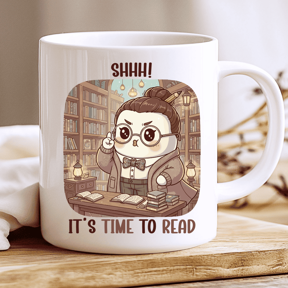 Shhh… It’s time to read is a cozy librarian mug designed for those who truly love books, quiet spaces, and the simple joy of getting lost in a good story. The illustration features an adorable librarian character standing confidently in a warm library, gently asking for silence while books fill every corner around them.