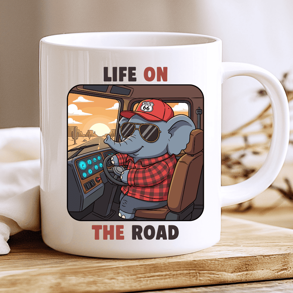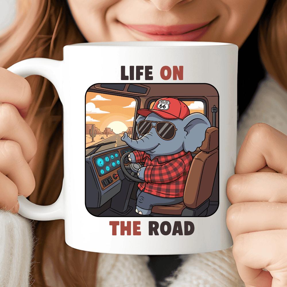 Life on the Road is a charming truck driver gift mug made for those who feel at home behind the wheel. The design features an adorable elephant trucker calmly driving a big rig, surrounded by a cozy cab and endless American highways stretching into the distance.
