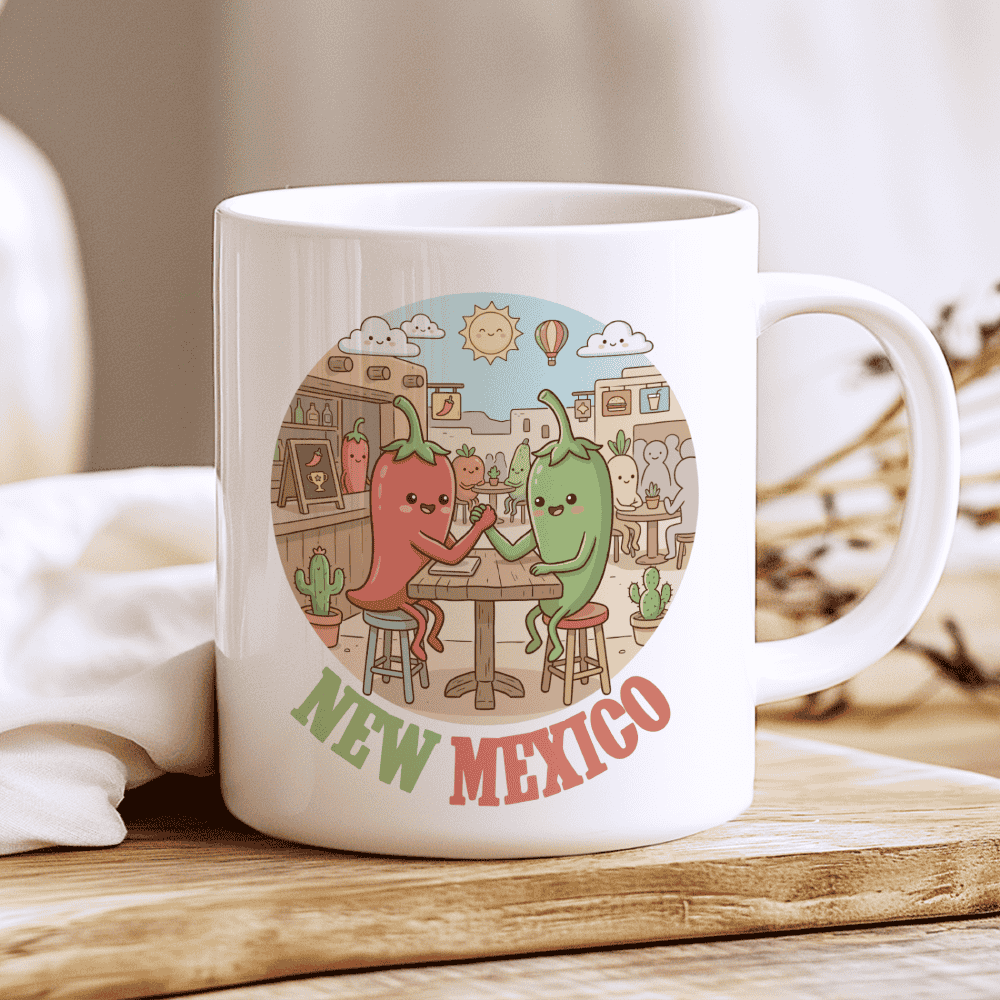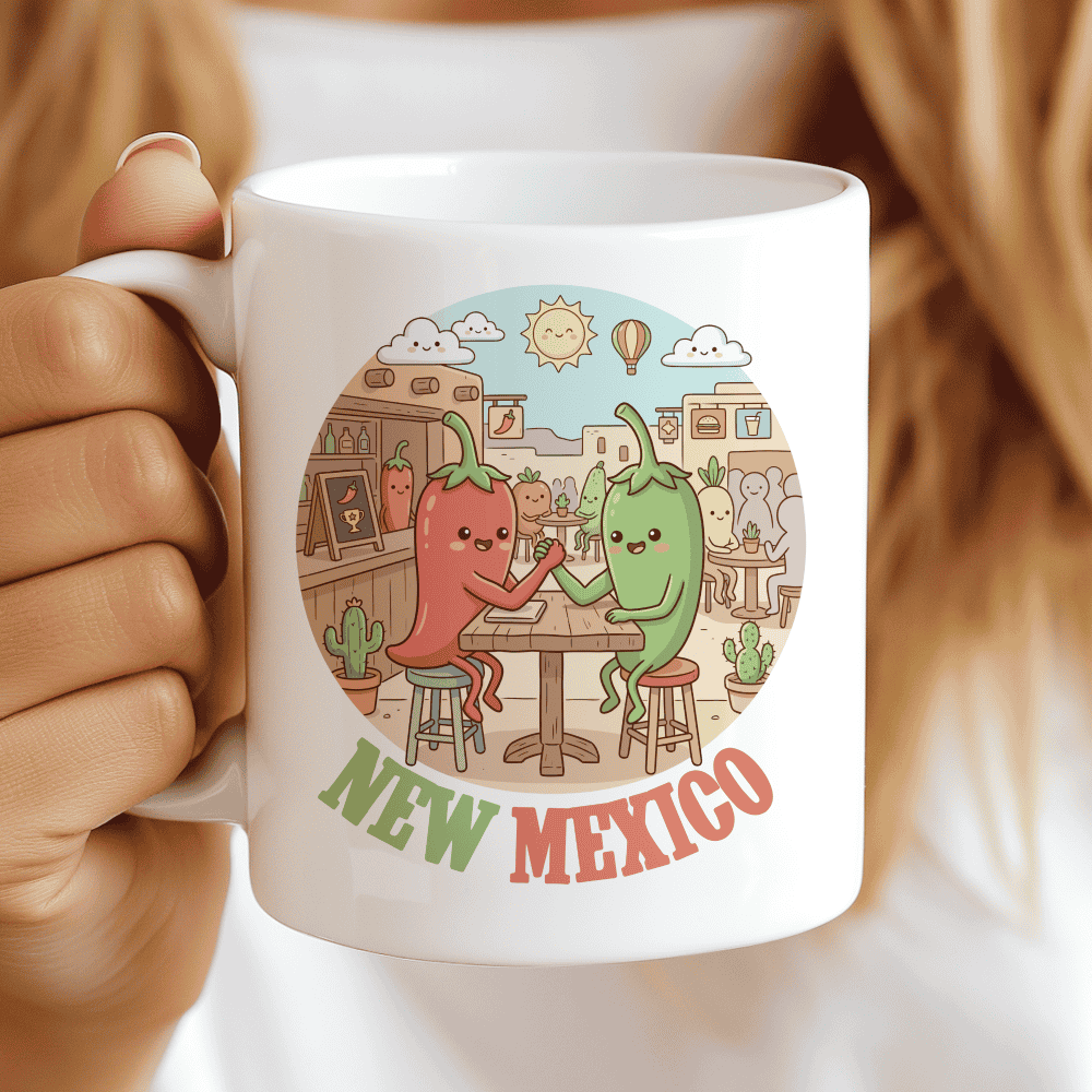 Red, Green, or Christmas? The Choice is Yours. Celebrate the legendary flavors of the Southwest with a New Mexico mug that captures the state’s true spirit. This illustration stars our most competitive characters yet—a pair of round, smiling chiles locked in a classic arm-wrestling duel. Set against a backdrop of sun-drenched adobe buildings, hanging ristras, and a sky dotted with happy clouds and hot air balloons, it’s the ideal New Mexico gift for those who know that life is better with a bit of spice.