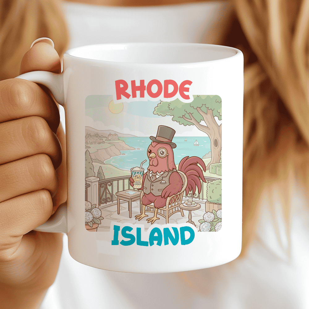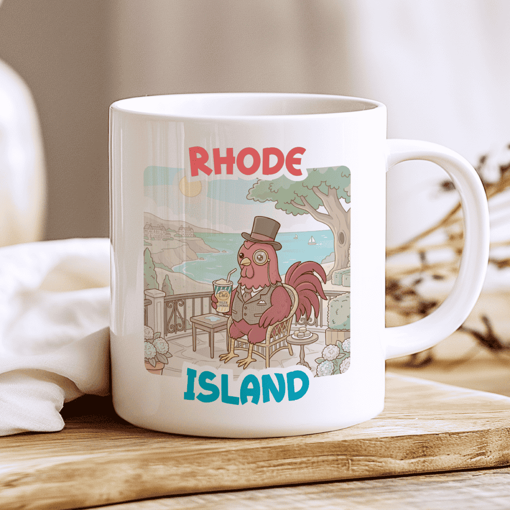Coastal Elegance Meets a Zesty Tradition. Bring a taste of the Atlantic to your kitchen with a Rhode Island mug that’s as refreshing as a summer breeze in Narragansett. This illustration stars our most “fabulous” character yet—a chubby Rhode Island Red rooster dressed in a formal vest and monocle. Relaxing in a wicker chair overlooking the iconic Cliff Walk and the blue waters of Newport, he’s holding the legendary yellow-and-green cup of frozen lemonade. It’s the ideal Rhode Island gift for those who appreciate the finer things in life—like mansions, sailboats, and the perfect balance of sweet and tart.