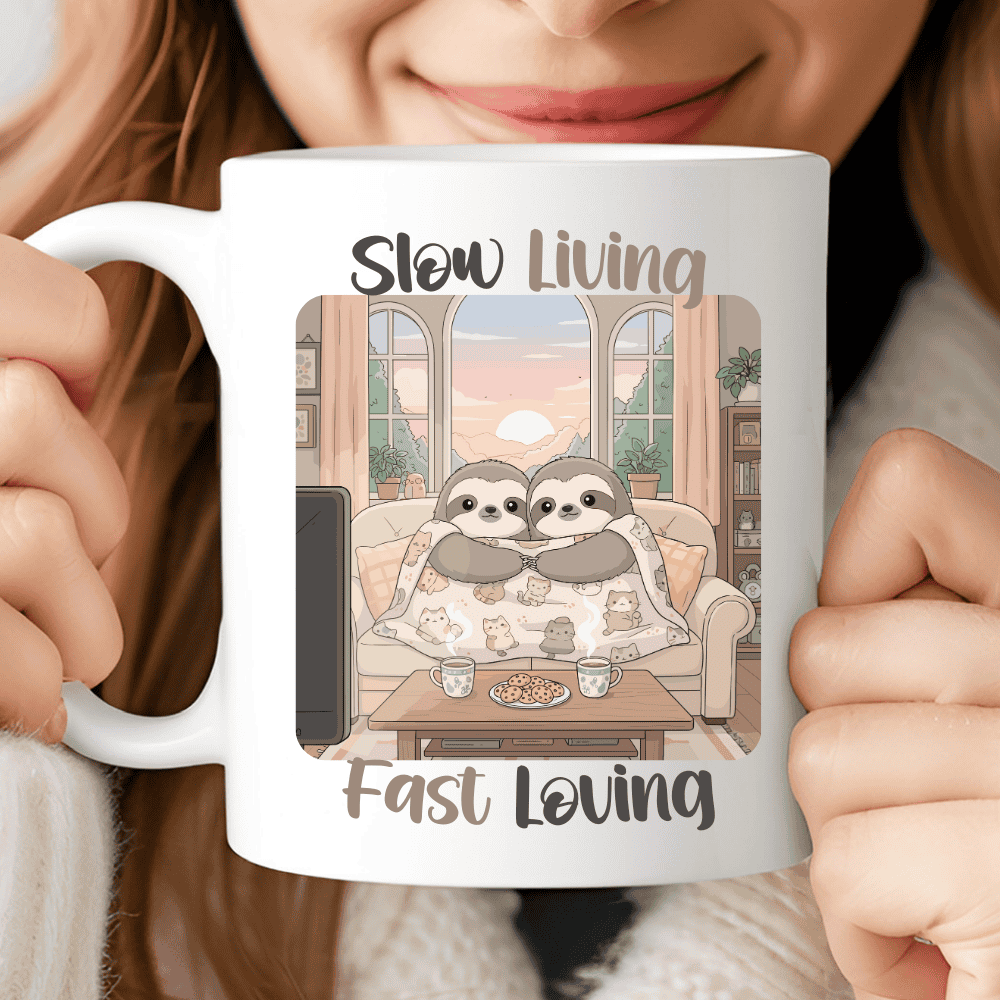 The Slow Living, Fast Loving Mug captures the sweetest kind of cozy romance. Two adorable sloths cuddle under a warm blanket while sharing cookies and a quiet moment together. A heartfelt love mug perfect for couples who enjoy slow days, soft hugs, and fast-growing affection.