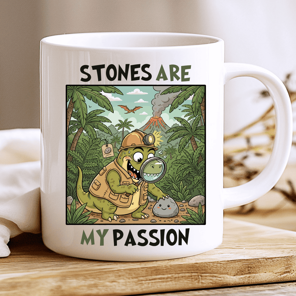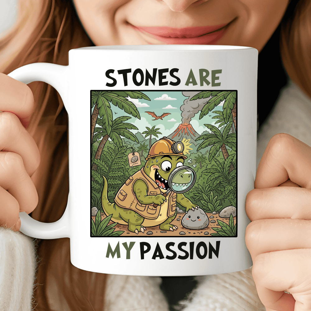 Stones Are My Passion is a playful geologist gift mug designed for anyone who loves rocks, fossils, and the thrill of discovery — even when the “find” turns out to be just a rock. The illustration features a cute dinosaur geologist wearing a mining helmet and magnifying glass, carefully examining a smiling stone with proud excitement.