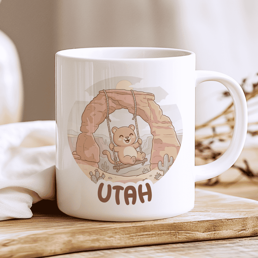 Swing into the magic of the High Desert with this adorable tribute to the “Beehive State.” Featuring a happy baby Cougar enjoying a peaceful moment on a swing under the iconic Delicate Arch, this design celebrates Utah’s red rock wonders and wild spirit. It’s a soulful, squishy-style keepsake that brings a dash of outdoor joy to your morning coffee.