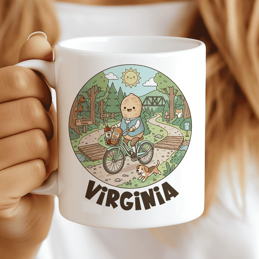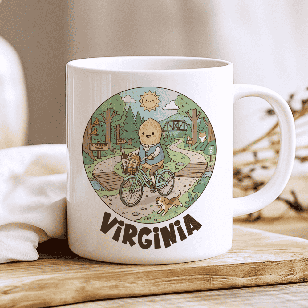 A Taste of Tradition on the Virginia Creeper Trail. Elevate your morning routine with a Virginia mug that’s as sophisticated as a vineyard at sunset. This illustration stars our most “distinguished” character yet—a chubby Virginia Peanut dressed in colonial finery, complete with a waistcoat and buckled shoes. Cruising past the lush forests of Abingdon and Damascus, with a playful Beagle by his side and the iconic wooden trestles in the background, he’s carrying a basket of the state’s finest treasures. It’s the ideal Virginia gift for trail lovers, wine enthusiasts, and anyone who knows that “Virginia is for Lovers” of history and snacks.