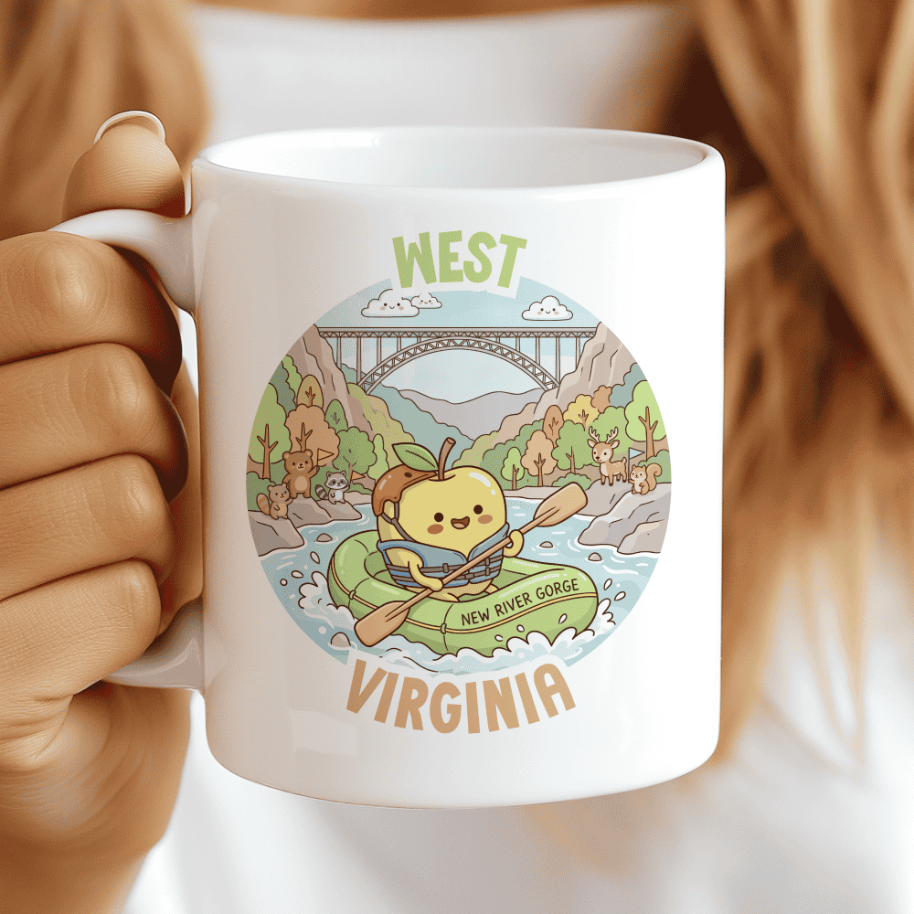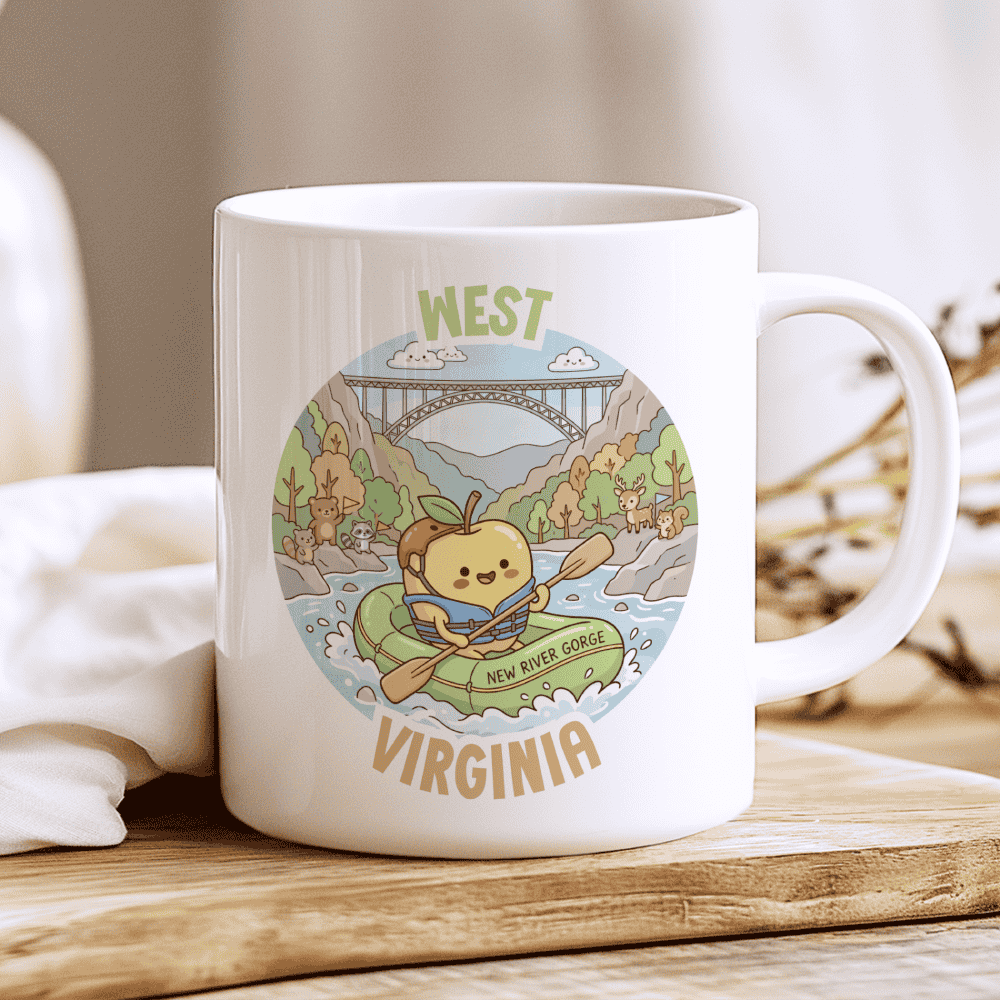 A Golden Ride Through the New River Gorge. Take your morning brew on a wild ride with a West Virginia mug that’s as bold as the Appalachian peaks. This illustration stars our most daring character yet—a round, smiling Golden Delicious apple wearing a safety helmet and life vest, expertly navigating a green raft. With the iconic New River Gorge Bridge towering in the background and a cheering squad of bears, raccoons, and deer along the rocky banks, it captures the ultimate “Almost Heaven” vibe. It’s the ideal West Virginia gift for whitewater rafters, hikers, and anyone who feels at home in the wild and wonderful outdoors.