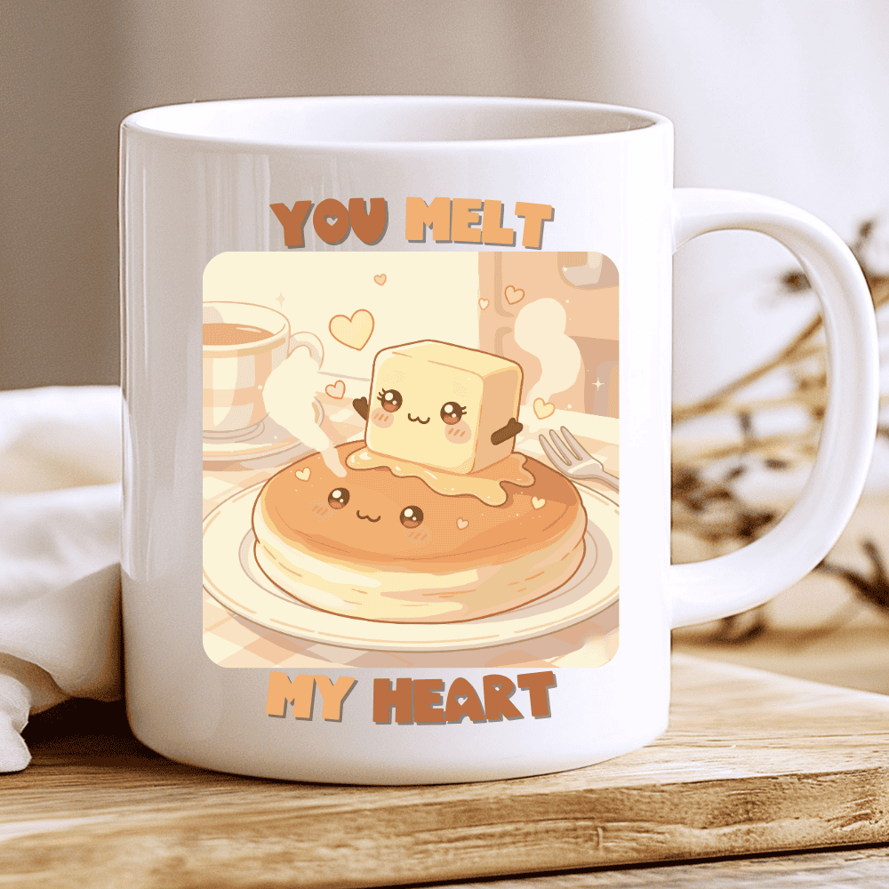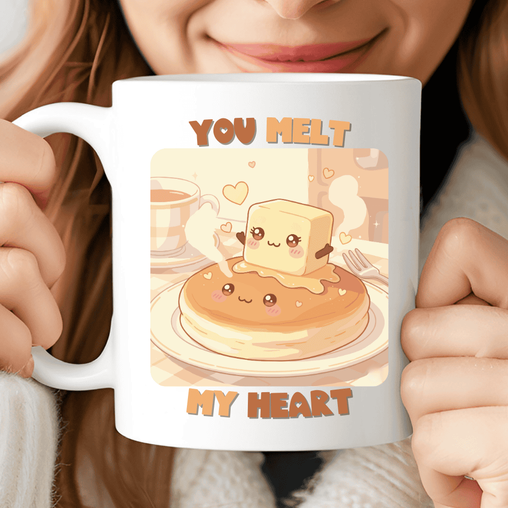 The You Melt My Heart Mug brings warm, buttery sweetness to your daily routine. A melting butter cube hugs a smiling pancake in a cozy breakfast scene filled with tiny hearts and soft pastel tones. Cute, comforting, and perfect for anyone who loves adorable love mugs.