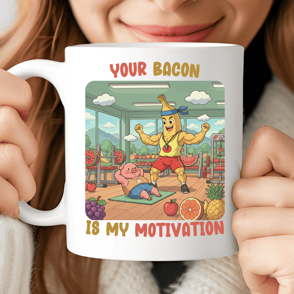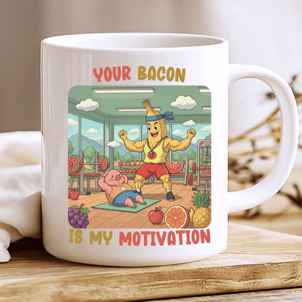 Your Bacon Is My Motivation is a playful and energetic personal trainer mug designed for those who love fitness — and don’t take it too seriously. The illustration features a strong, cheerful banana acting as a personal trainer, motivating a pig during a workout session in a bright, fruit-filled gym.